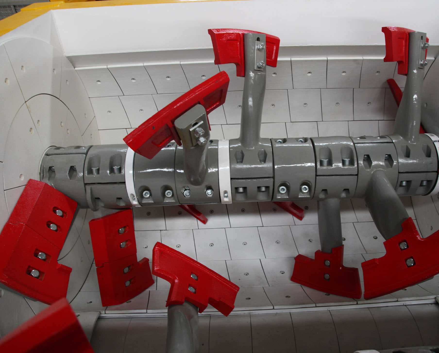 两搅拌轴反向同步旋转,带动螺旋形式分布的搅拌臂和搅拌叶片,驱动物料作径向翻转运动和轴向回转移动。通过对物料运动轨迹动态模拟优化和数十次实物搅拌试验,确定了最佳的搅拌臂布置形式和搅拌叶片角度,实现了搅拌效率高,匀质性好,能耗低。